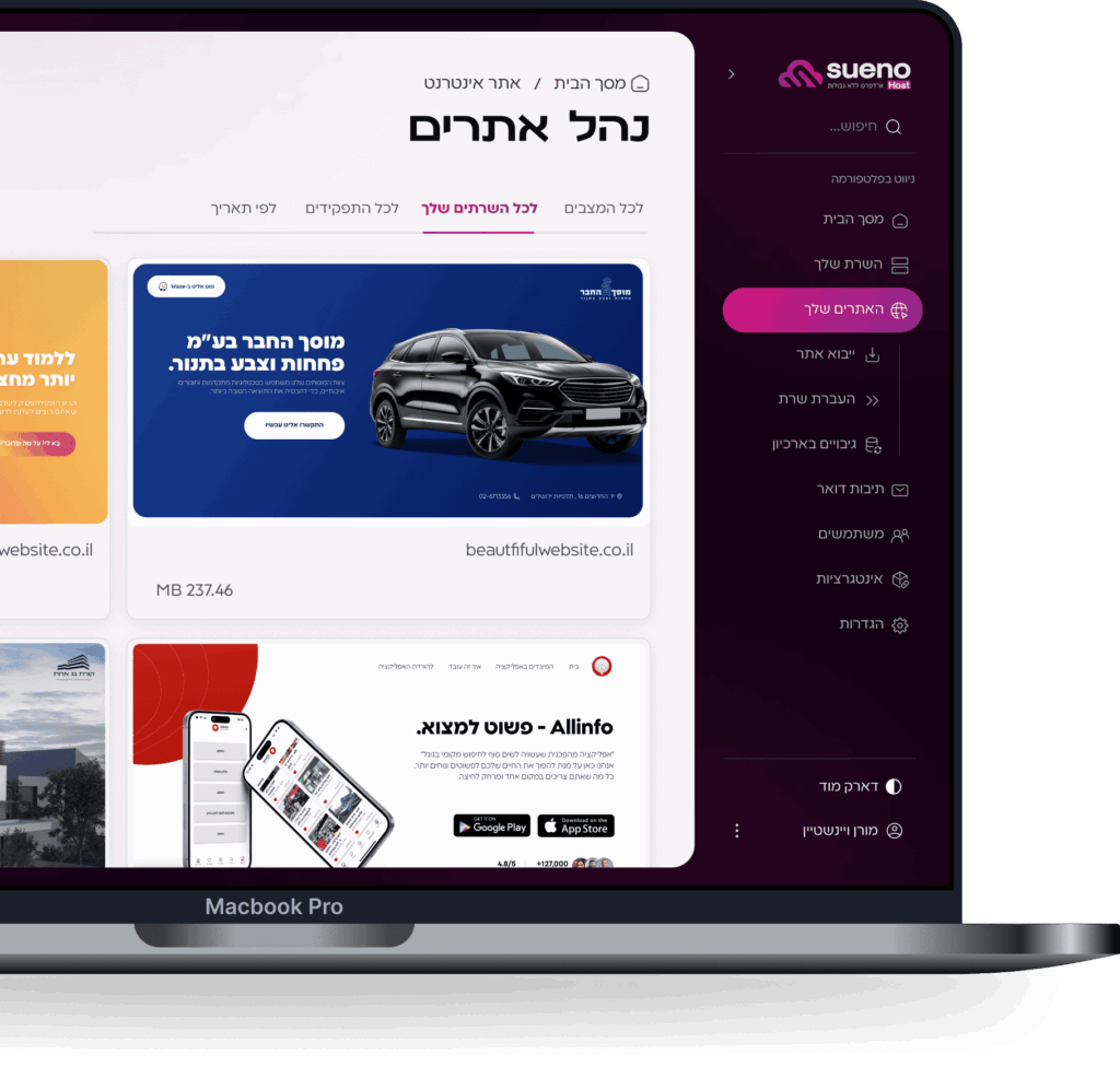 ניהול קבצים, דומיינים, תיבות דואר, גיבויים והגדרות אתר בצורה פשוטה וברורה.